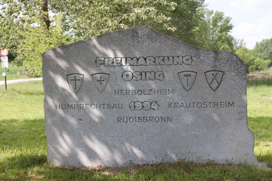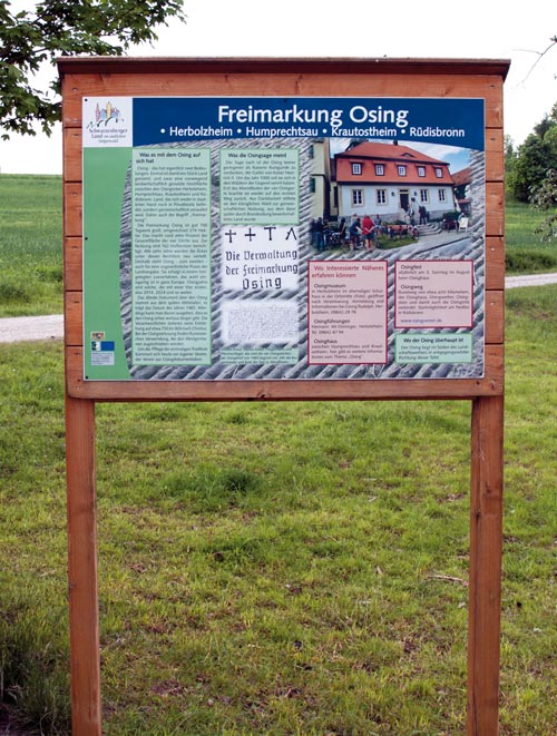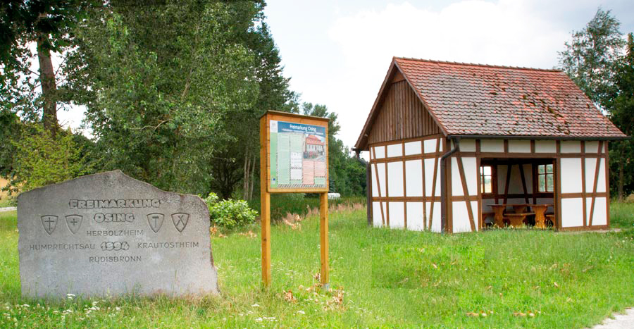 Die Sage erzählt, dass der Osing von Hohenkottenheim bis Spielberg Wald war. Beide Burgen sind heute zerstört. Die Gräfin zu Hohenkottenheim besuchte ihre Verwandten auf Spielberg, aber auf dem Heimweg verirrte sie sich im Wald. Bei Einbruch der Nacht hörte sie die Abendglocken der vier Orte, Humprechtsau, Herbolzheim, Krautostheim und Rüdisbronn läuten, dadurch fand sie sich wieder zurecht und kam glücklich nach Hause. Aus Dankbarkeit für die Errettung schenkte sie den Wald allen vier Orten zu gleichen Teilen. Laut Überlieferung ist der Osing ein Geschenk der Kaiserin Kunigunde, sie war die Gemahlin Heinrichs II der zwischen 1002-1024 regierte. Diese Überlieferung ist aber sehr stark anzuzweifeln. Weiter wird die Gemahlin Karls des Großen, Fastrada, mit dem Osing in Verbindung gebracht, sie soll im Königshof Windsheim geweilt haben und sich auf der Jagd verirrt haben. Ursprünglich war der Höhenrücken Osing ein Grenzwald zwischen Ehegau und Rangau. Die Siedler der Altsiedlungsorte Herbolzheim und Krautostheim trieben seit der Landnahme ihr Vieh in diesen Wald. Als die beiden Neusiedlungen Humprechtsau und Rüdisbronn (800-850) entstanden wurde der Wald auch von diesen Siedlern genutzt. Die letzte Neusiedlung Humprechtsau erhielt bereits Teile des ursprünglichen Osings. All diese Merkmals lassen nur den Schluss zu, dass die Rodung und die Entstehung der Freimarkung zwischen 750 und 800 liegen. Zusätzliche Bestätigung gibt die Verwendung der Osingzeichen bei der Osingverlosung. Der Grund für die Rodung lässt sich durch die Einführung des Christentums erklären. Durch die Einführung des Christentums musste der zehnte Teil an die Kirche abgetreten werden und dies ließ sich nur durch zusätzliche Ackerbauflächen realisieren. Die Fläche des Osings beträgt fast exakt 10% der Gesamtfläche der Osinggemeinden. Alle Umstände die zur Rodung des Osings geführt haben weisen einhellig auf die Zeit Karls des Großen hin. Mehrdeutig erscheint allerdings der Name "Osing" der auf einen "Hütewald" hinweist, der "verößigt", gleichsam ausgeraubt war. Durch die Abholzung und das anschließende Verbrennen von Wurzelwerk und Unterholz gewann man zusätzliches Ackerland und Asche zur Düngung. Der Name Osing kommt aus dem mittelhochdeutschen "asanc", dies bedeutet "absengen, Abgesengtes". Der Osing wird 1424 das erste Mal genannt in der Brandenburgischen Geleitwegeordnung. Ein erster urkundlicher Nachweis über den Osing stammt aus dem Jahre 1465. Das älteste Schriftstück der Osingbrief stammt aus dem Jahre 1587 und befindet sich im Besitz der Osingrechtler aus Humprechtsau. Die Siegel stammen unter anderen vom Bischof zu Würzburg, vom Kastenamt Hoheneck(1), von Ludwig von Seinsheim zu Hohenkottenheim und der Stadt Windsheim. Während des Bauernkrieges 1525 trafen sich auf dem Kleinen Osing, bei der Huriwiese, nachts die Bauern mit ihren Führern und erhielten ihre Befehle für die weiteren Kämpfe. Der Name "Huri" bedeutet "hurig aus hurwig, von hur(w), hor(w)" = Sumpf und dies ist, da sie im Wald unterhalb des Kehrenberg liegt, nicht ungewöhnlich. Zusätzlich wird, bzw. wurde sie von dem sogenannten "Zigeunerbrünnlein" befeuchtet das oberhalb im Wald liegt. In der heutigen Zeit ist das Wasser dieser Quelle nahezu versiegt. In der "Osingurkunde" wird von drei "Seelein" berichtet, wovon nur noch der "Osingsee" existiert. Ein zweiter, abgegangener See, befand im näheren Bereich der "Huri" Wiese und somit auch im Bereich des "Zigeunerbrünnleins", aus dem sich früher erhebliche Wassermengen ergossen haben und somit den See mit Wasser belieferte. Dieser See lag günstig am früheren Schaf- und Kuhtrieb und konnte somit als Viehtränke genutzt werden. Seit der Zeit der Landnahme durch die Franken führen über den Osing sogenannte "Rennwege", es waren die Verbindungswege zwischen fränkischen Königshöfen. Diese Wege führten alle an der Kalten Eiche (da sie an einen Nordhang steht wird sie "Kalte Eiche" genannt) vorbei nach Krautostheim und dann weiter nach Herbolzheim und Gollhofen. In den Jahren 1937 und 1938 wurden auf dem Osing die Krautostheimer Sonnwendfeuer entzündet. 1937 bis 1940 befand sich ein Segelflugplatz auf dem Kleinen Osing in der nähe des jetzigen Wasserhaus, er wurde von der Segelfliegergruppe aus Windsheim betrieben. Die Segelflugzeuge wurden von mehreren Personen die einen Gummi spannen mußten zum Abheben gebracht.