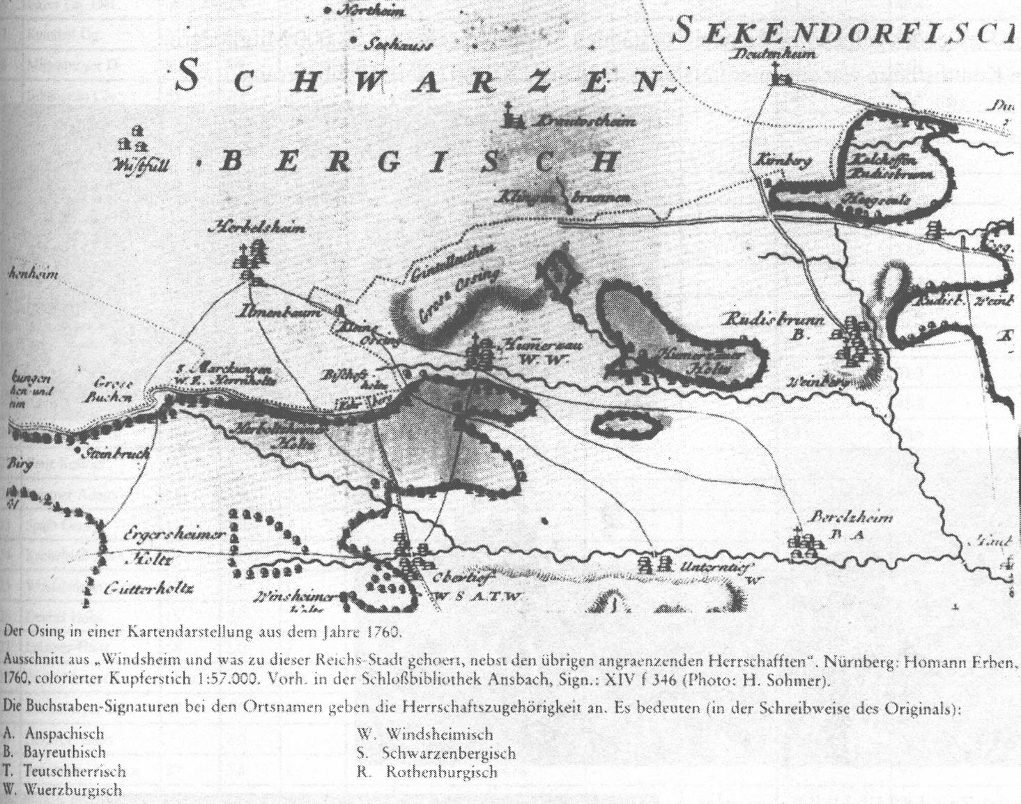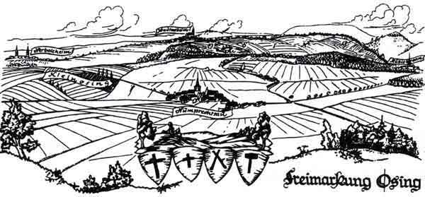 Die Fläche des Osings beträgt fast exakt 10 % der Gesamtfläche der Osinggemeinden. Alle Umstände die zur Rodung des Osings geführt haben weisen einhellig auf die Zeit Karls des Großen hin. Alle Merkmale lassen nur den Schluss zu, daß die Rodung und die Entstehung der Freimarkung zwischen 750 und 800 liegt. Zusätzliche Bestätigung soll die Verwendung der Osingzeichen bei der Osingverlosung sein. Der Name "Osing" deutet auf einen "Hütewald" hin, der "verößigt", gleichsam ausgeraubt war. Osing kommt aus dem mittelhochdeutschen Wort "asanc", dies bedeutet "absengen, Abgesengtes". Durch die Abholzung und das anschließende Verbrennen von Wurzelwerk und Unterholz gewann man zusätzliches Ackerland und Asche zur Düngung. Der Osing wird 1424 das erste mal genannt in der Brandenburgischen Geleitwegordnung. Ein erster urkundlicher Nachweis über den Osing stammt aus dem Jahre 1465, es ist ein Klagebrief der Stadt Windsheim. Die älteste Urkunde zum Osing, der Osingbrief, stammt aus dem Jahre 1587 und befindet sich im Besitz der Osingrechtler. Alle 10 Jahre wird die Fläche des Osings unter den Rechtlern der vier Osinggemeinden verlost, jeweils wenn die Jahreszahl mit "4" endet. Das nächste mal also 2034.