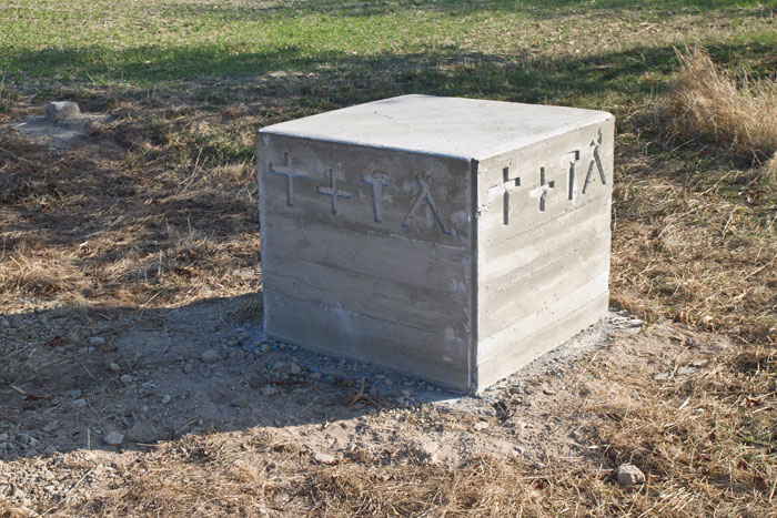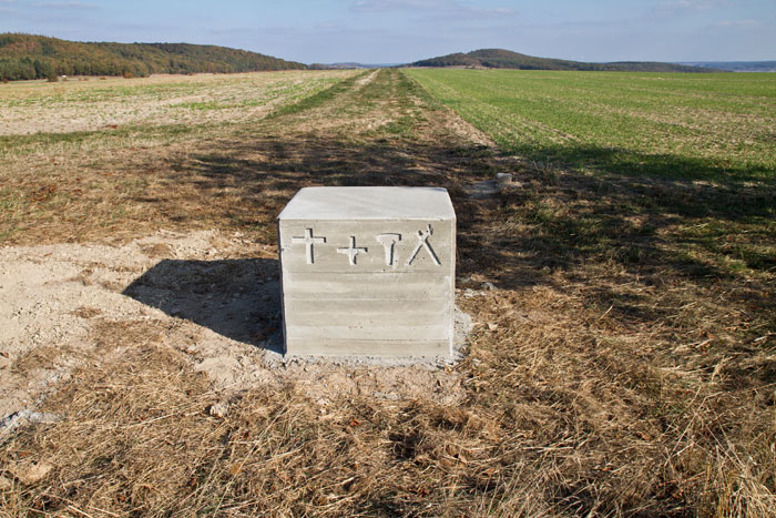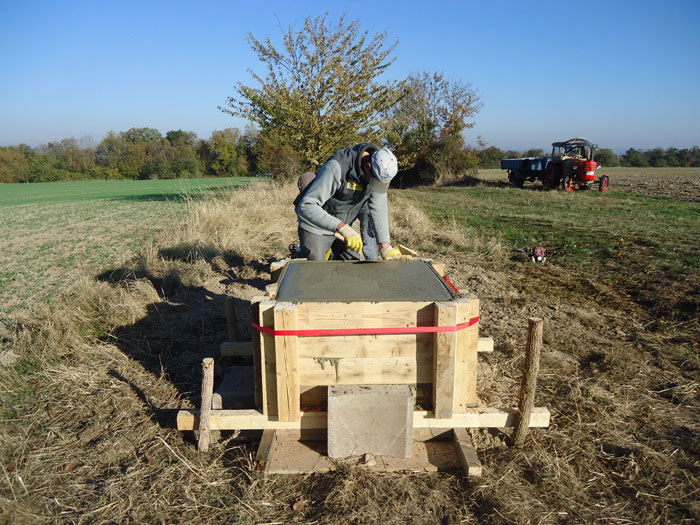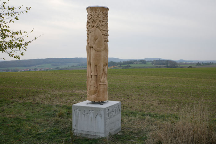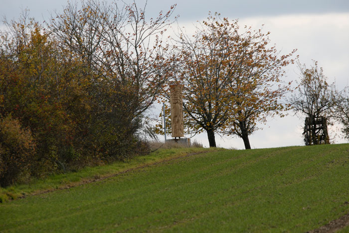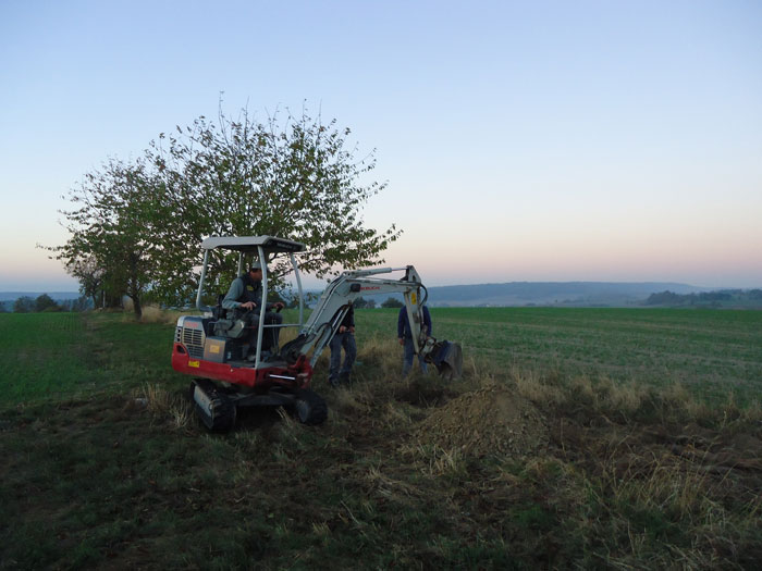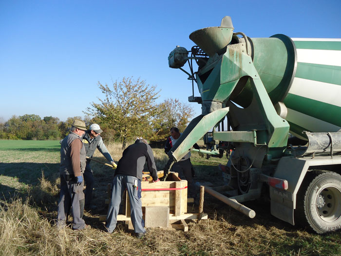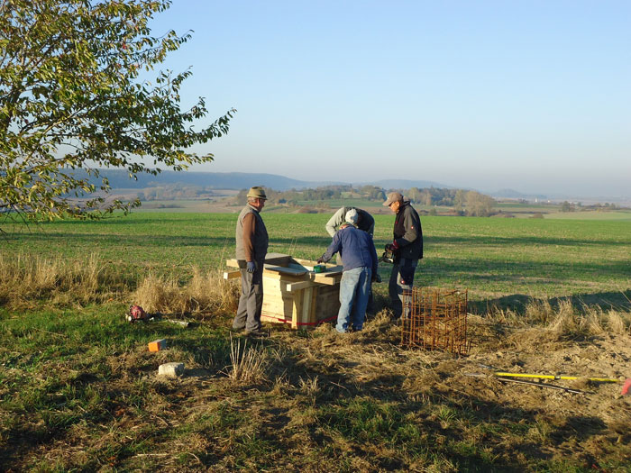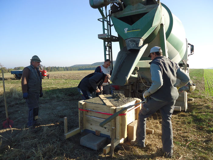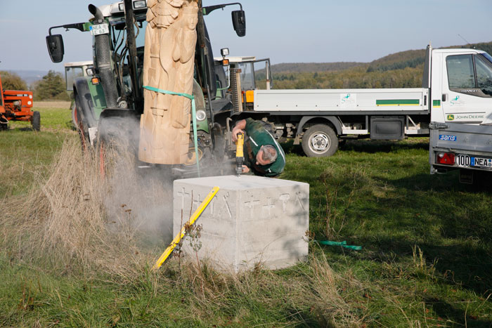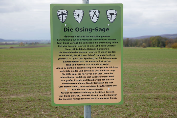 Die Planung und Erstellung der Rundwanderwege auf dem Osing war eine sehr langwierige Angelegenheit und begann bereits 2015 mit den abgehen der Wege. Gleichzeitig wurde der Gedanken geboren ein Erkennungsmerkmal auf dem höchsten Punkt des Osings zu errichten. Nach einiger Diskussion entschied sich die Vorstandschaft des Vereins zur Osingdokumentation e.V. für eine aus Eichenholz gefertigte Statue der Kaiserin Kunigunde. Die Kaiserin steht auf einem Betonsockel in dem die vier Osingzeichen auf jeder Seite zu sehen sind. Der Blick der Kaiserin richtet sich gegen Südwesten mit Blick über den Osing. In ihrem Rücken steht der Spielberg, der seit etlichen Jahren einen Aussichtsturm hat und im Zusammenhang mit der Osingsage steht. Der Wanderer und Besucher dieses Aussichtsturmes wird belohnt mit einer weit über den Osing nach Westen reichenden Aussicht. Den gleichen Ausblick gewährt der Turm gegen Südost in den Aischgrund und gegen Süden Richtung Bad Windsheim und die Frankenhöhe. Wobei hier ein Fernglas eine große Hilfe sein kann. Nachdem die Planungen zur Statue der Kaiserin Kunigunde abgeschlossen waren begannen am Samstag den 13.Oktober 2018 die ersten optisch erkennbaren Aktivitäten auf dem Osing. Für die sich seit über zwei Jahren in Planung und Arbeit befindlichen zwei Rundwanderwege wurde auf dem höchsten Punkt des Osings das Fundament und gleichzeitiges Podest für die Skulptur der Kaiserin Kunigunde ausgehoben, geschalt und betoniert. Die Fa. Fleischmann aus Rüdisbronn brachte ihre Baugeräte zum Einsatz, dadurch konnten die Schachtarbeiten zügig erledigt werden. Vorstandsmitglied Wilhelm Greifenstein hatte die komplette Schalung mit den Osingzeichen vorgefertigt. Somit wurde die veranschlagte Arbeitszeit stark reduziert. Durch den angelieferten Beton der in die Schalung gegossen wurde konnten die ersten Arbeiten abgeschlossen werden.